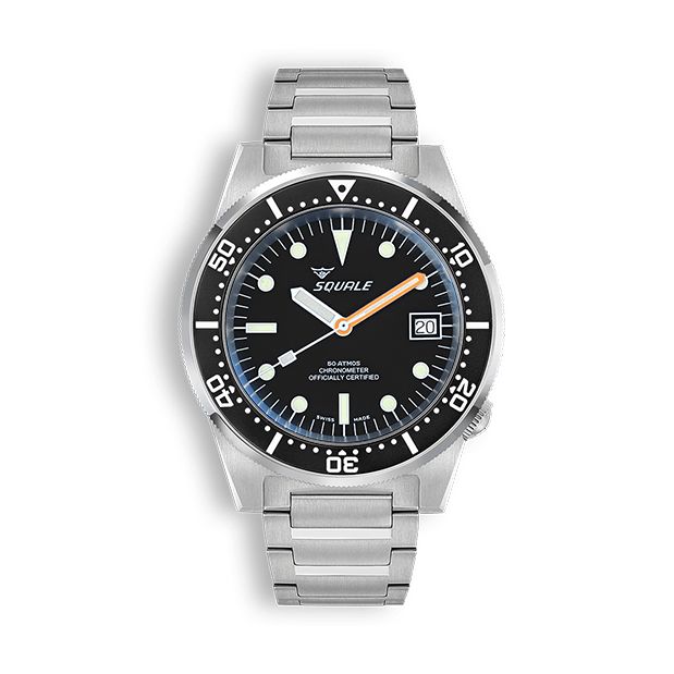 Squale 1521 met datumaanduiding, zwarte lunette en 38 uur gangreserve.