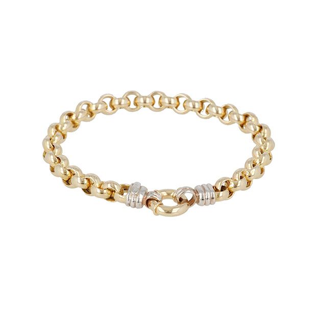 Het Be 14 karaat geelgouden jasseron armband heeft witgouden elementen bij de jasseron sluiting.