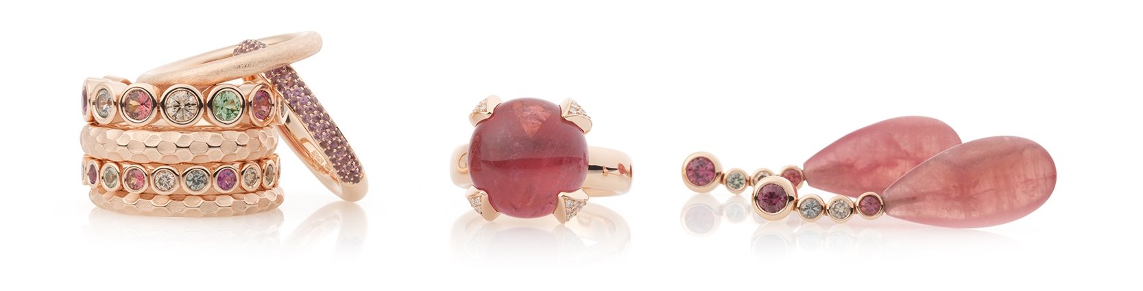 De ruige Scottish Highlands staan garant voor regen en mist. Als behaaglijk tegenwicht zoeken we onze toevlucht tot warme lamswol en dichtgeweven tweed. Daarin komen de karakteristieke contrastkleuren van de Schotse clans naar voren: vlammend rode Rhodochrosiet naast koele maansteen, lieflijk rose zirkoon geflankeerd door winters labradoriet, en een stemmig grijs parelcollier opgevrolijkt door rode toermalijn.
