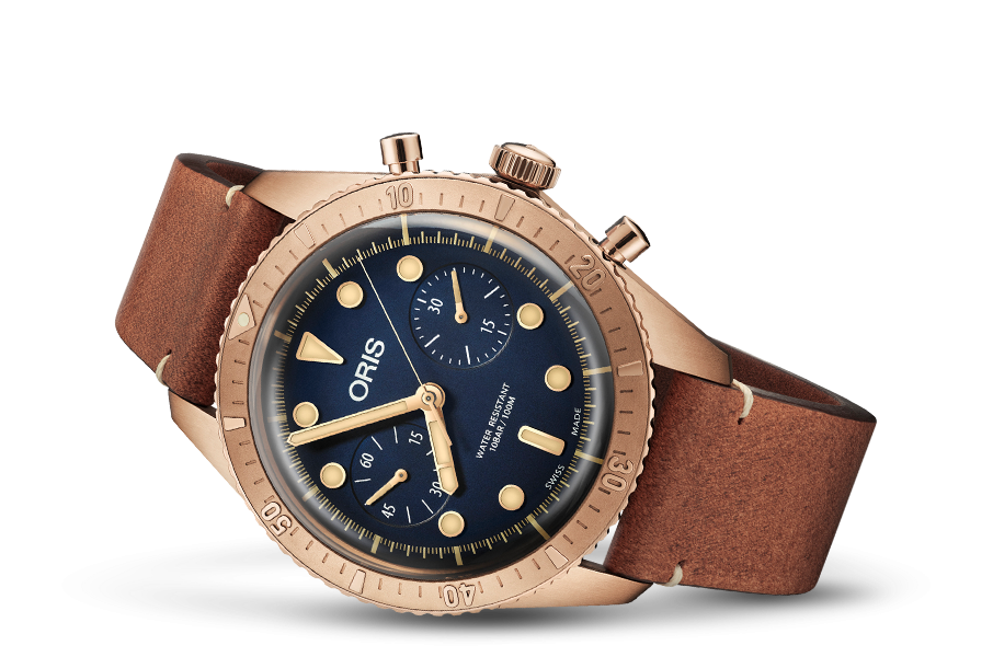 In 2016 bracht Oris voor het eerst zijn limited edition Carl Brashear Diver 65 uit. Waar we de laatste jaren steeds meer bronzen horloges zien, bracht Oris dit als één van de eerste merken uit. Het horloge was een overweldigend succes, en was dan ook binnen de kortste keren uitverkocht. Met zijn diepzee blauwe wijzerplaat en bol saffierglas was het een bijzondere verschijning voor een bijzondere prijs. Nu twee jaar na het succes van het eerste model brengt Oris een vervolg model uit van de Carl Brashear. Dit keer heeft Oris gekozen voor een chronograaf duiker. Ook dit model heeft weer een diepblauwe wijzerplaat en bol saffierglas. De bronzen kast heeft gepolijste onderdelen waardoor er een mooi contrast ontstaat. Het horloge heeft een stalen achter deksel waardoor mensen met een allergie voor brons geen last zullen hebben om het horloge te dragen. Het leuke van bronzen horlogekasten is dat het met de tijd veranderen zal van kleur en het allemaal verschillende vormen en bewerkingen aan zal nemen.