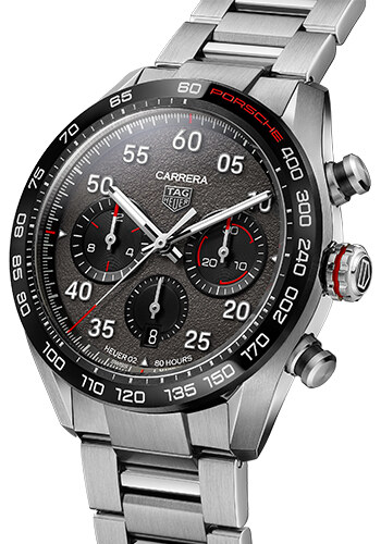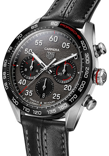 De lederen band van het horloge is gestikt met exact hetzelfde stiksel dat gebruikt wordt in de auto’s van Porsche. De Arabische cijfers op de wijzerplaat zijn in het gepatenteerde en bekende lettertype van de Porsche Carrera. Het Porsche rood op de lunette verwijst naar de rode letters waarmee Porsche de naam van het model aanduidt op de auto’s en als laatste is er een speciale wijzerplaat ontworpen voor het model met de structuur van asfalt. Deze subtiele details halen direct het gevoel van Porsche naar boven en sluiten perfect aan op het TAG Heuer Carrera design.