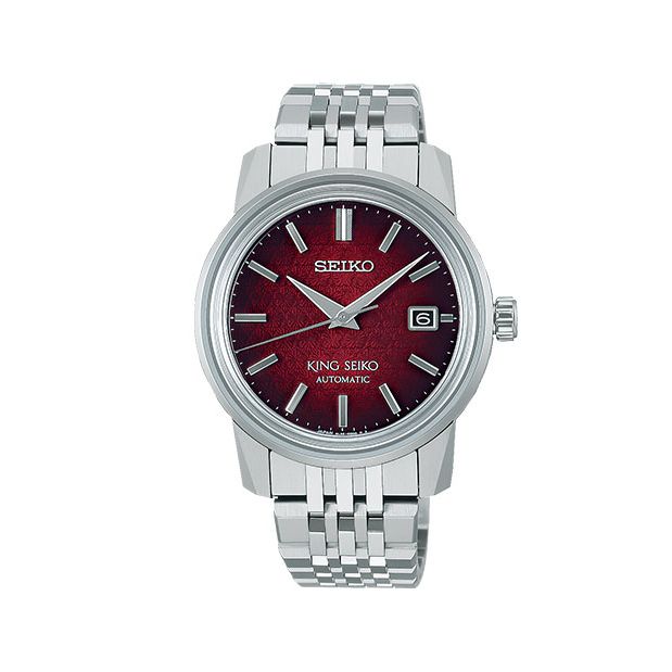In de huidige King Seiko collectie vindt je natuurlijk modellen met een klassieke lakzwarte of zilverkleuirge sunburst wijzerplaat, maar Seiko zou Seiko niet zijn als ze geen fascinerende kleuren en patronen zouden gebruiken. Neem bijvoorbeeld de diepe rode fumé wijzerplaat met een subtiel bloemenpatroon. Deze is zeker de moeite waard om in onze tijdelijke King Seiko corner te komen bewonderen.