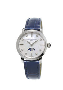En voor de dames een ieuw model in de collectie.De Frederique Constante Slimline: een eerbetoon aan fijne Genève uurwerken, verenigen stijl, elegantie en hoge kwaliteit voor een mooi prijs. Parelmoer wijzerplaat bezet met diamant index en maanfase.