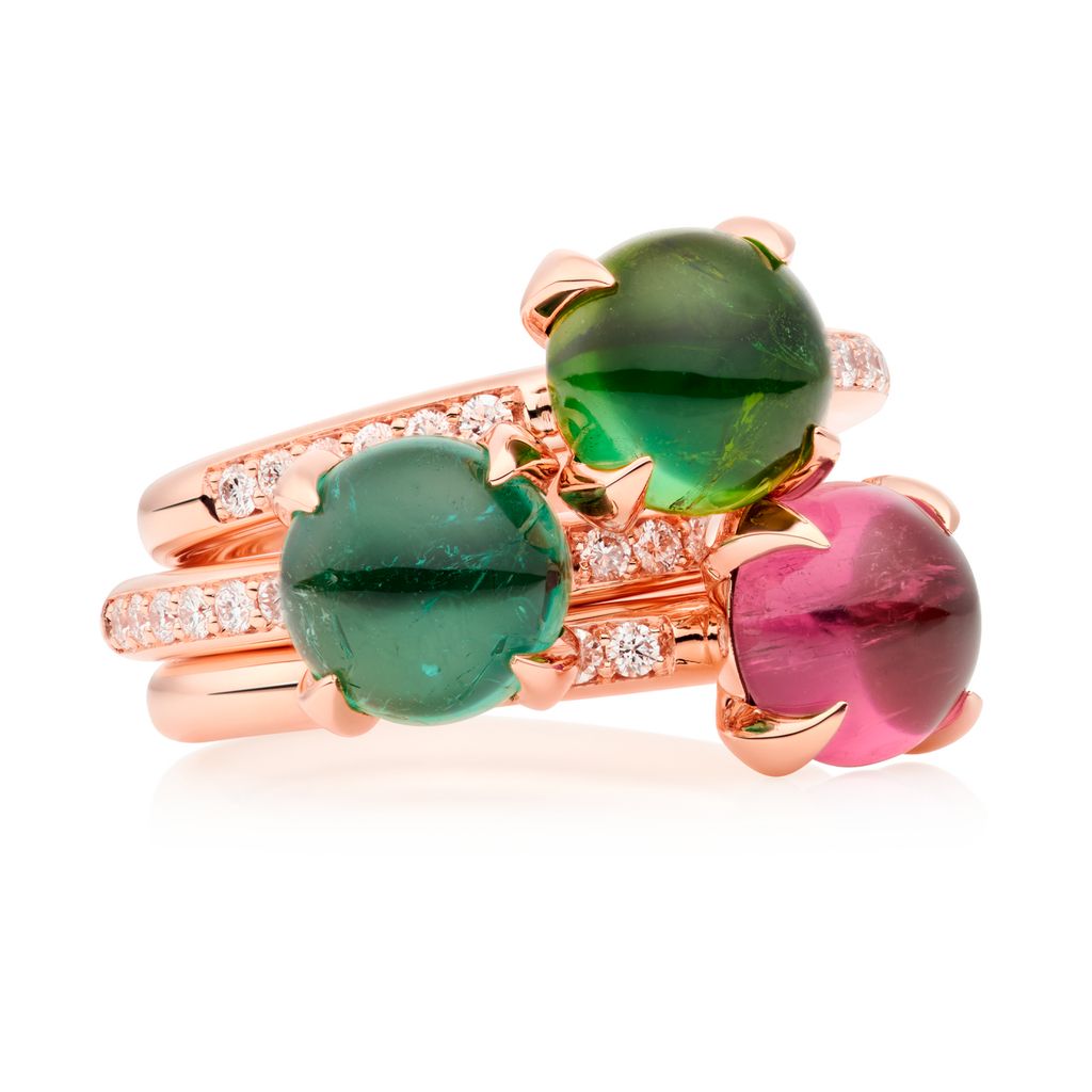 Deze Catch-ring van Bron heeft een diepgroene toermalijn in klauwzetting, met diamanten langs de zijkant van de roségouden band. Het contrast tussen de gladde cabochon en de sprankelende diamanten geeft een eigentijdse twist. Een verfijnd sieraad met een vleugje kleur.