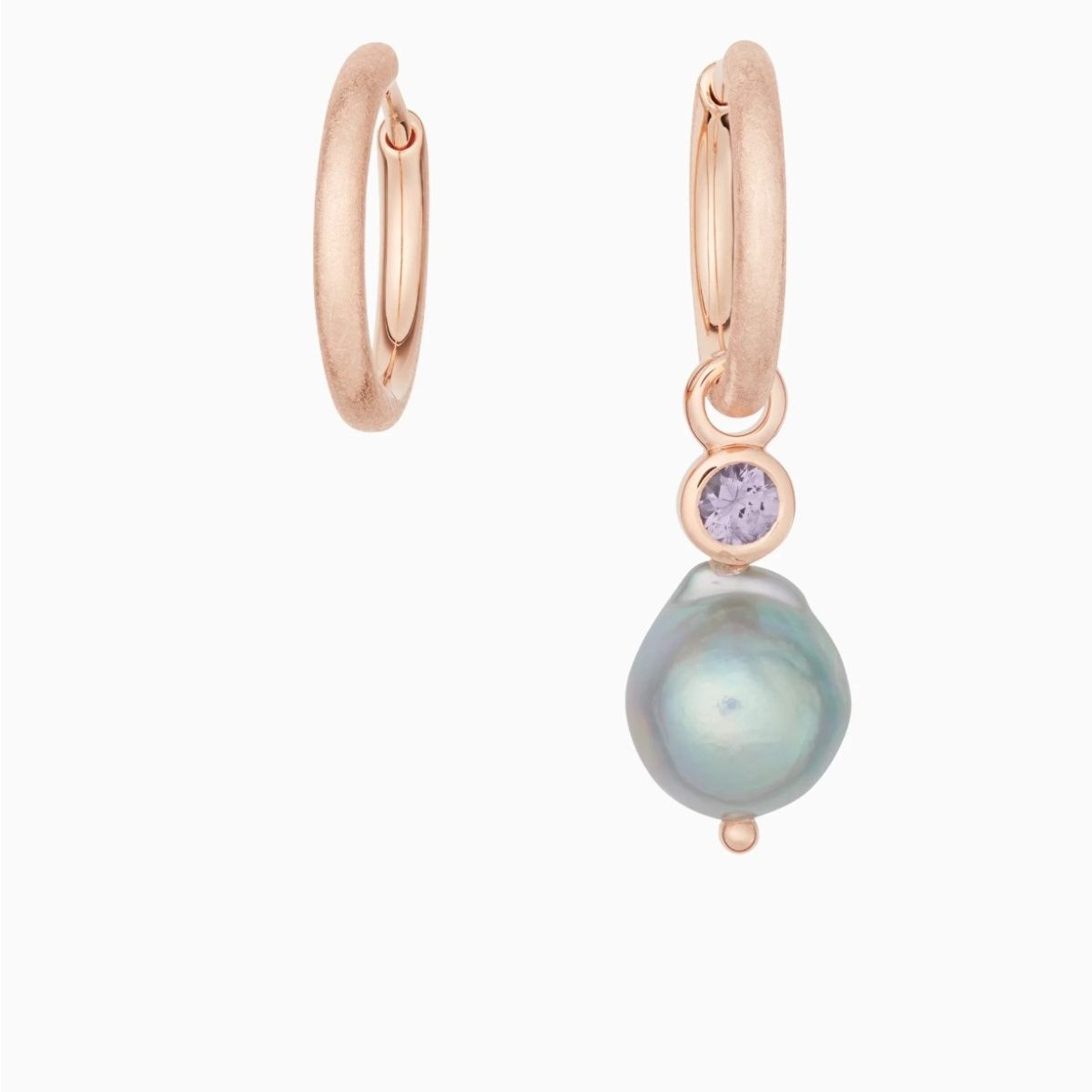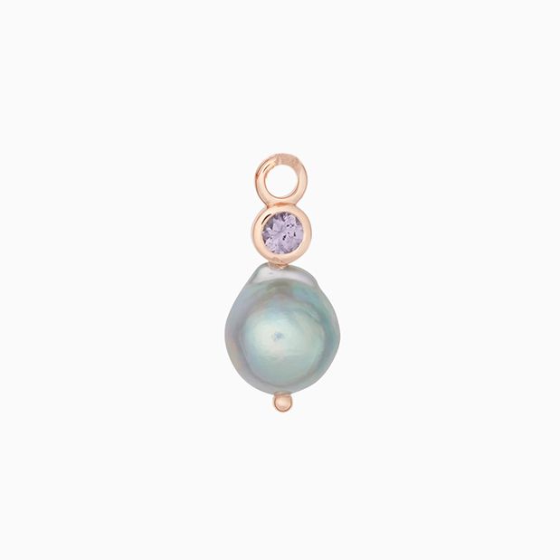 Gematteerde oorringen met single aanhanger; zeldzame blauwe barok Akoya parel met lila saffier erboven. Oorringen en aanhanger worden ook los van elkaar verkocht.