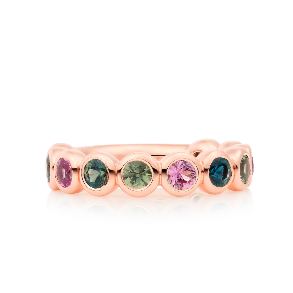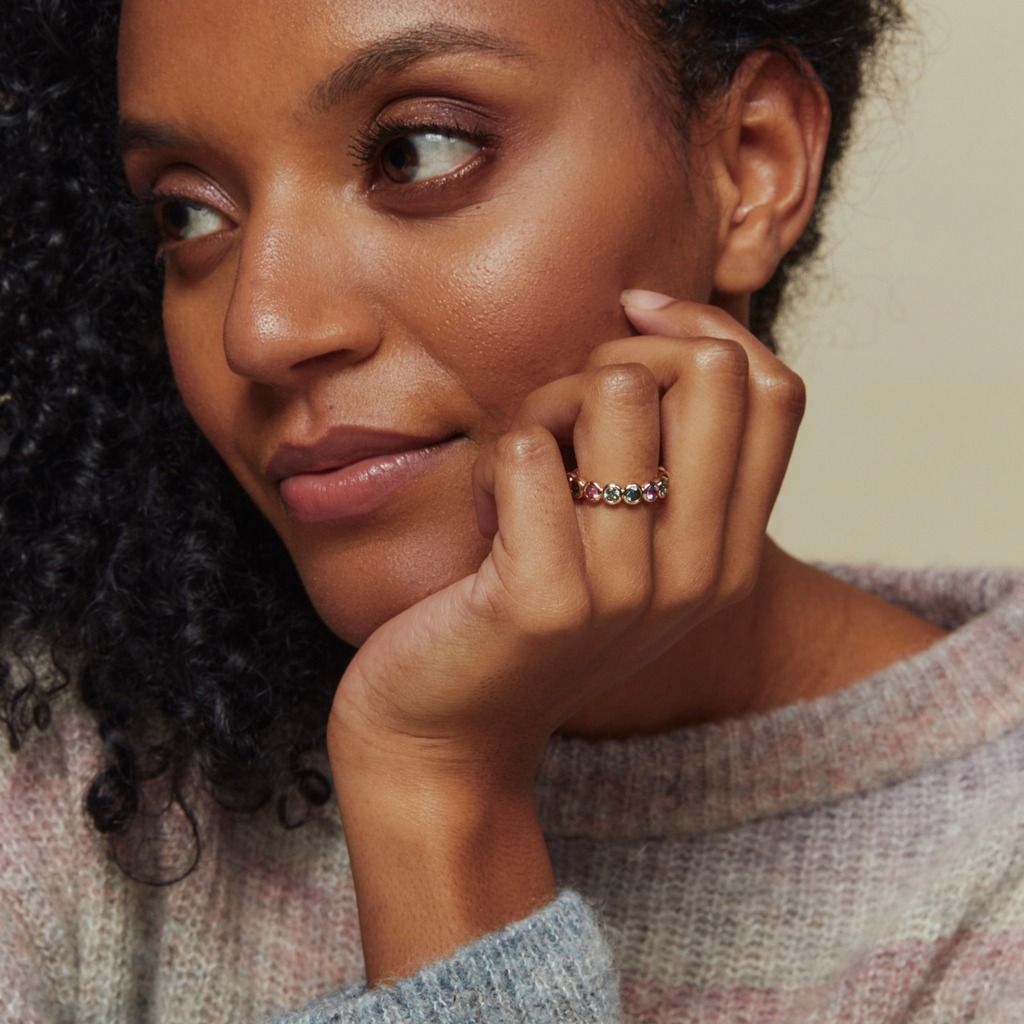 Vrolijk van karakter, de Confetti-ring met korundmix is een kleurrijke viering van vakmanschap en speels design. Gezet in warm roségoud, is elke edelsteen zorgvuldig gekozen om een harmonieuze combinatie van groene, roze en blauwe tinten te creëren. Een verfijnd sieraad vol persoonlijkheid – perfect om te stapelen of solo te dragen als opvallend kleuraccent.