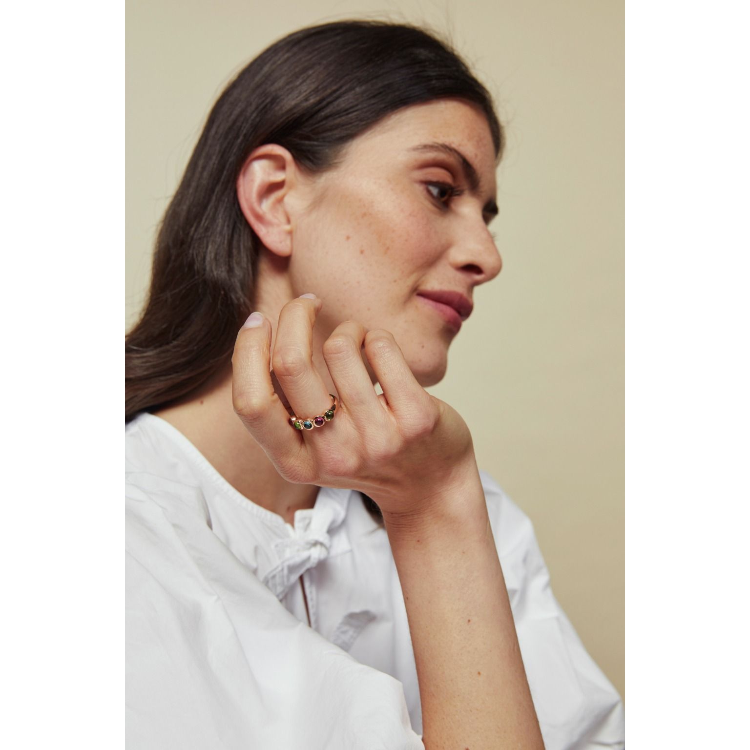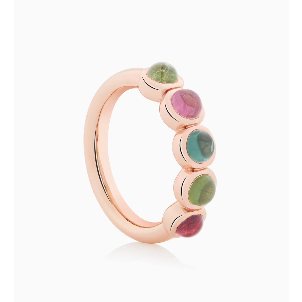 Deze Confetti-ring van Bron is uitgevoerd met een speelse mix van cabochon geslepen toermalijnen in roségoud. De bolle stenen benadrukken de natuurlijke kleuren en het karakter van elke edelsteen. Een vrolijk sieraad dat kleur geeft aan je collectie.