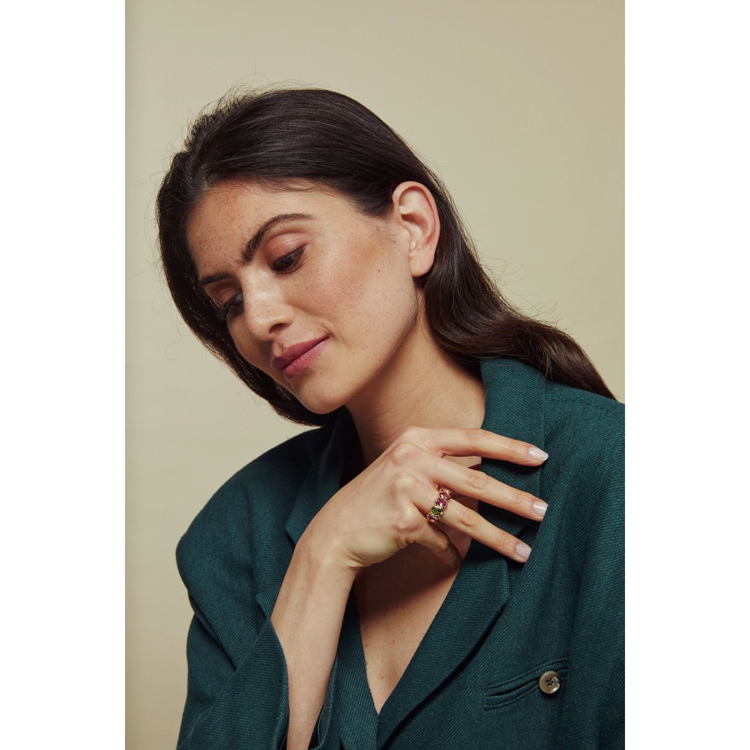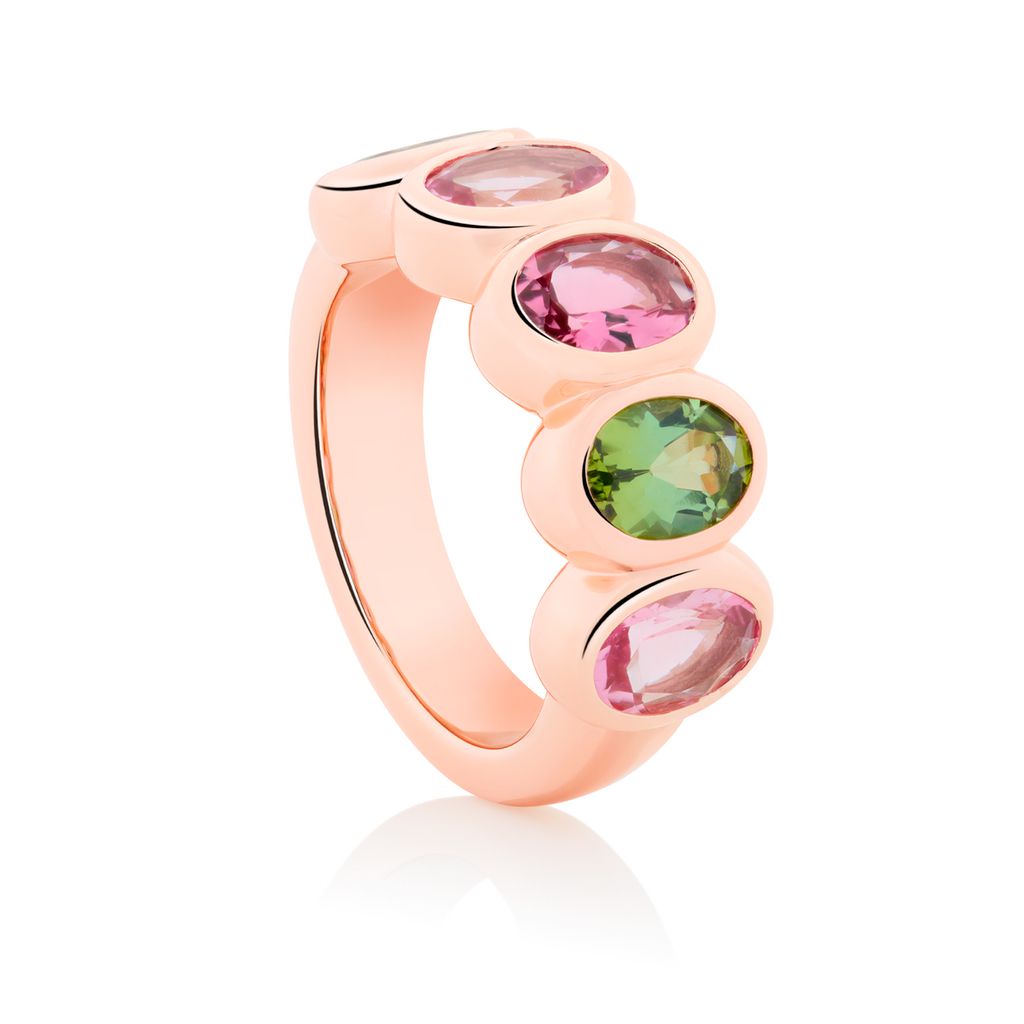 De Bron Sushi ring is een sprankelend meesterwerk dat speelse elegantie en verfijning combineert. De mix van schitterende toermalijnen in zachte roze- en groentinten komt prachtig tot leven in de warme gloed van roségoud. Een tijdloos sieraad dat kleur, karakter en vakmanschap op unieke wijze samenbrengt!
