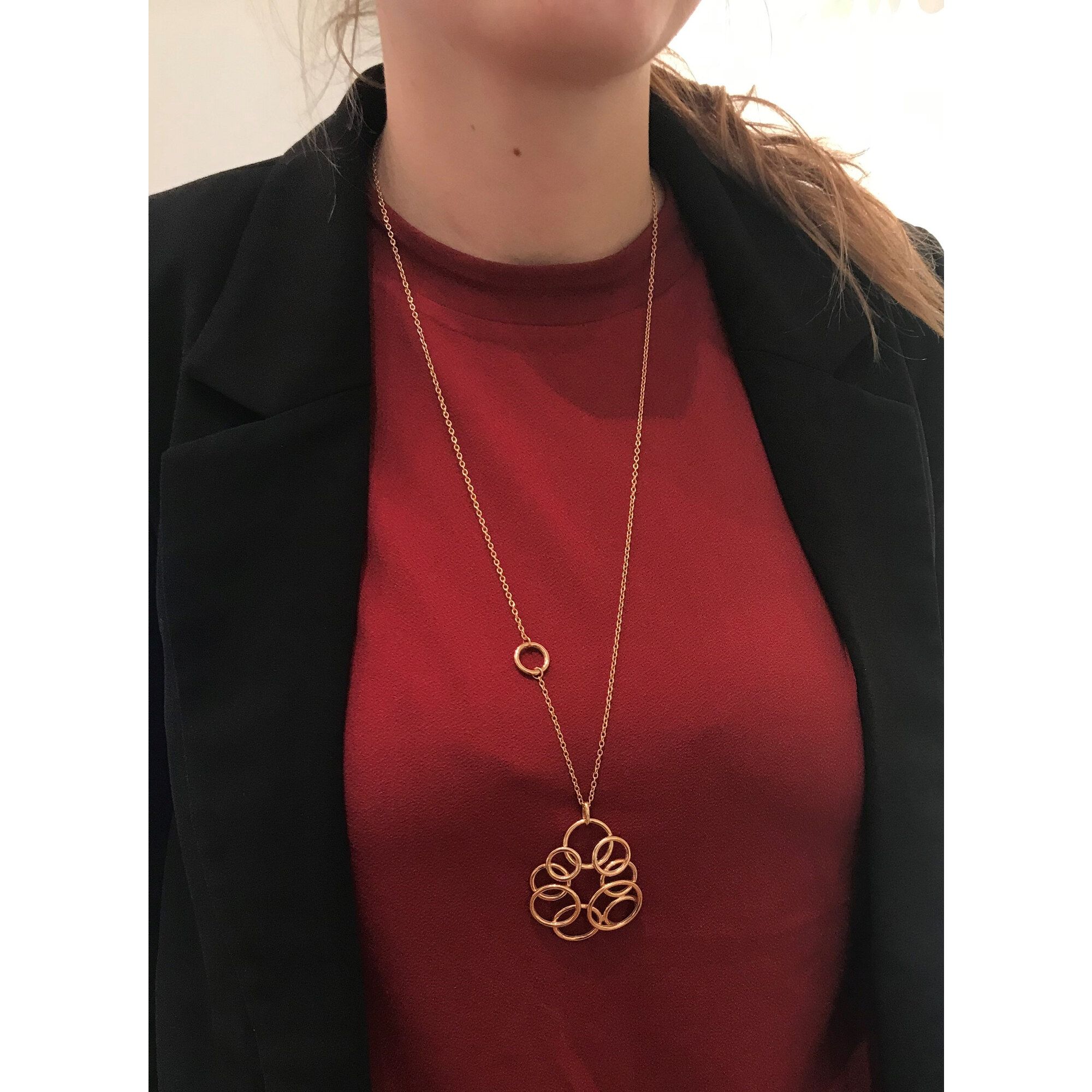 Dit Dot collier met hanger is vervaardig van 14 karaat roségoud en heeft een lengte van 70cm. De hanger bestaat uit meerder cirkels die op een fantasierijke manier zijn gepositioneerd.