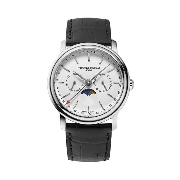 Deze Frederique Constant Business Timer heeft een maanfase, week, datum en dag wijzer