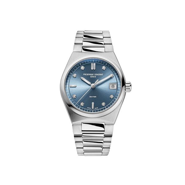 Deze Frederique Constant Highlife met frisse blauwe wijzerplaat met fonkelende diamanten index.