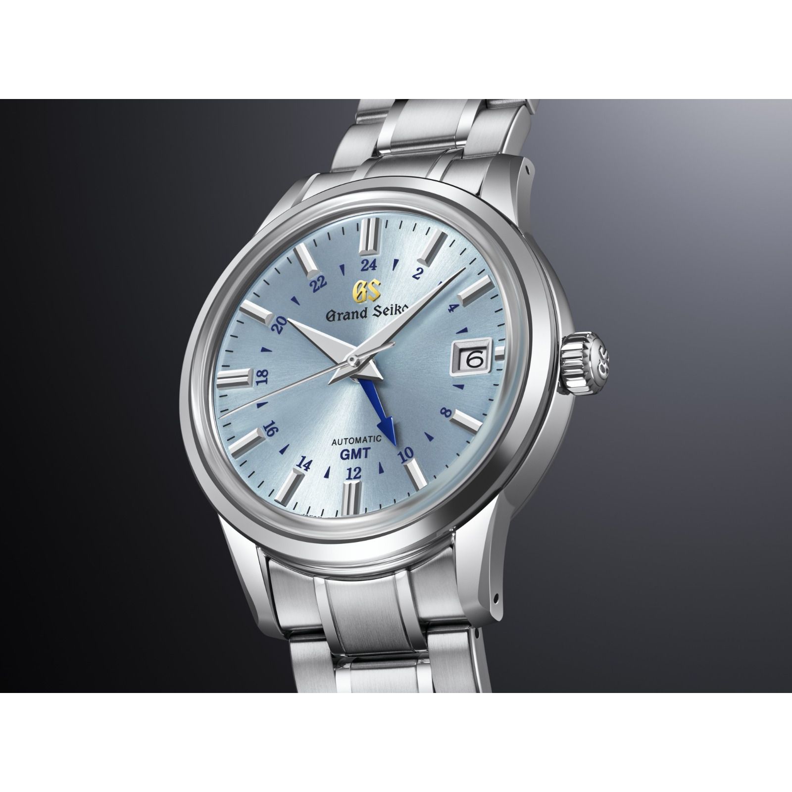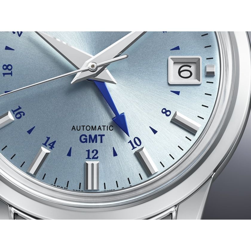 - Wijzerplaat: Ligt blauw met blauwe GMT-wijzer