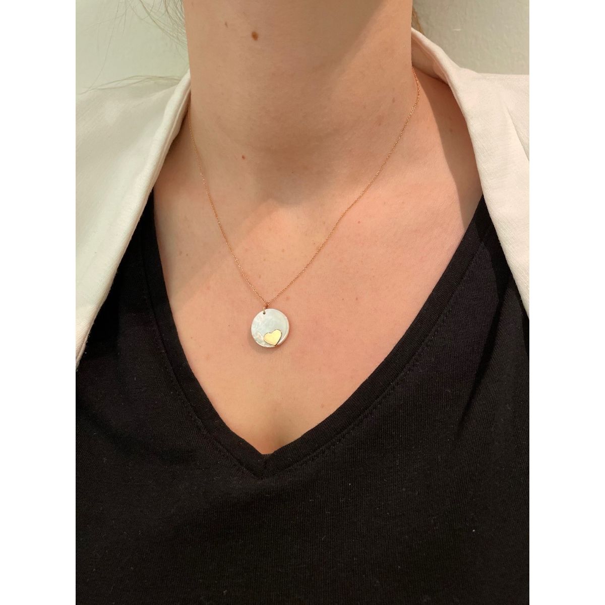 De hanger is gemaakt van een schijfje parelmoer en 2 roségouden plaatjes. Bij de voorkant van de hanger is een roségoud hartje te zien. Aan de achterkant van de hanger is een ajour gezaagd plaatje te zien gezet met 1 diamant.
