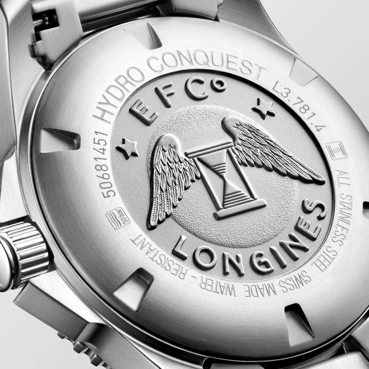Longines Hydroconquest met datumaanduiding, groen keramiek lunet en 64 uur gangreserve.