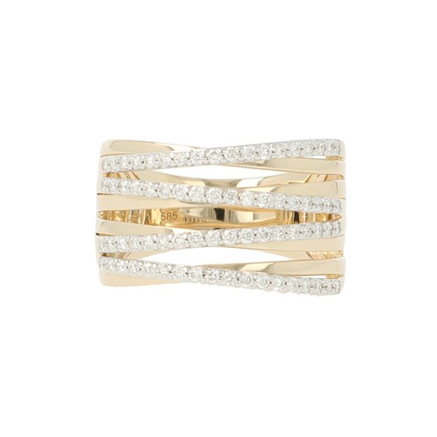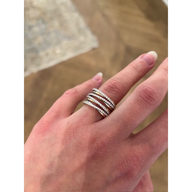 Deze brede banenring van Lux Diamonds is uitgevoerd in geelgoud met afwisselend gepolijste banen en banen vol pavé gezette diamanten. De golvende lijnen zorgen voor een dynamisch effect met een strakke, elegante uitstraling. Een opvallend sieraad dat schittert vanuit elke hoek.