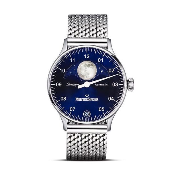 Meistersinger Lunascope met één wijzer met maanfase, datum en 38 uur gangreserve.