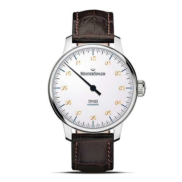 Meistersinger No.03 met één wijzer en 38 uur gangreserve. Eventueel ook verkrijgbaar met vouwsluiting á €100,- klik hier om deze te bestellen