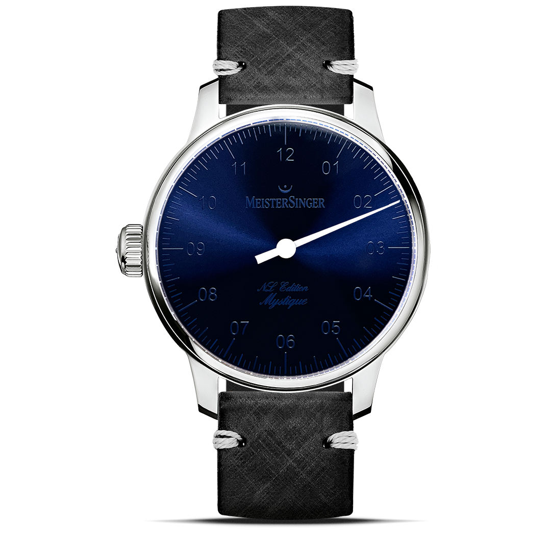 De Meistersinger No. 3 NL Mystique edition lijkt op het eerste oogopslag op een erg simpel horloge. Maar de schijn bedriegt! de Mystique editie heeft namelijk een donkerblauwe sunburst wijzerplaat met donkerblauwe uuraanduidingen. Dit zorgt ervoor dat de wijzerplaat, buiten direct licht, egaal donkerblauw van kleur lijkt. Echter zodra er licht op de wijzeprlaat valt worden de nummers op de wijzerplaat duidelijk zichtbaar. De Meistersinger Mystique NL edition is gelimiteerd tot 123 stuks. Deze zijn exclsuief verkrijgbaar bij nederlandse Meistersinger dealers. Bij dit horloge zit zowel de gele als de zwarte lederen band inbegrepen. Dankzij het "quick-release" systeem zijn de banden gemakkelijk thuis om te wisselen.