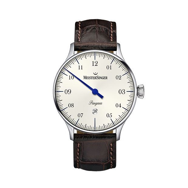 Meistersinger Pangaea Date met één wijzer, datum en 42 uur gangreserve. Eventueel ook verkrijgbaar met vouwsluiting á €100,- klik hier om deze te bestellen
