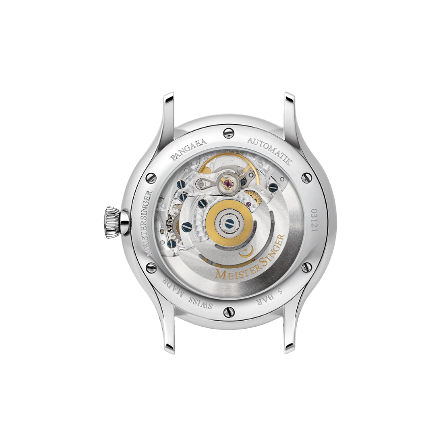 Meistersinger Pangaea Day-Date met één wijzer, dag/datumaanduiding en 38 uur gangreserve. Eventueel ook verkrijgbaar met vouwsluiting á €100,- klik hier om deze te bestellen