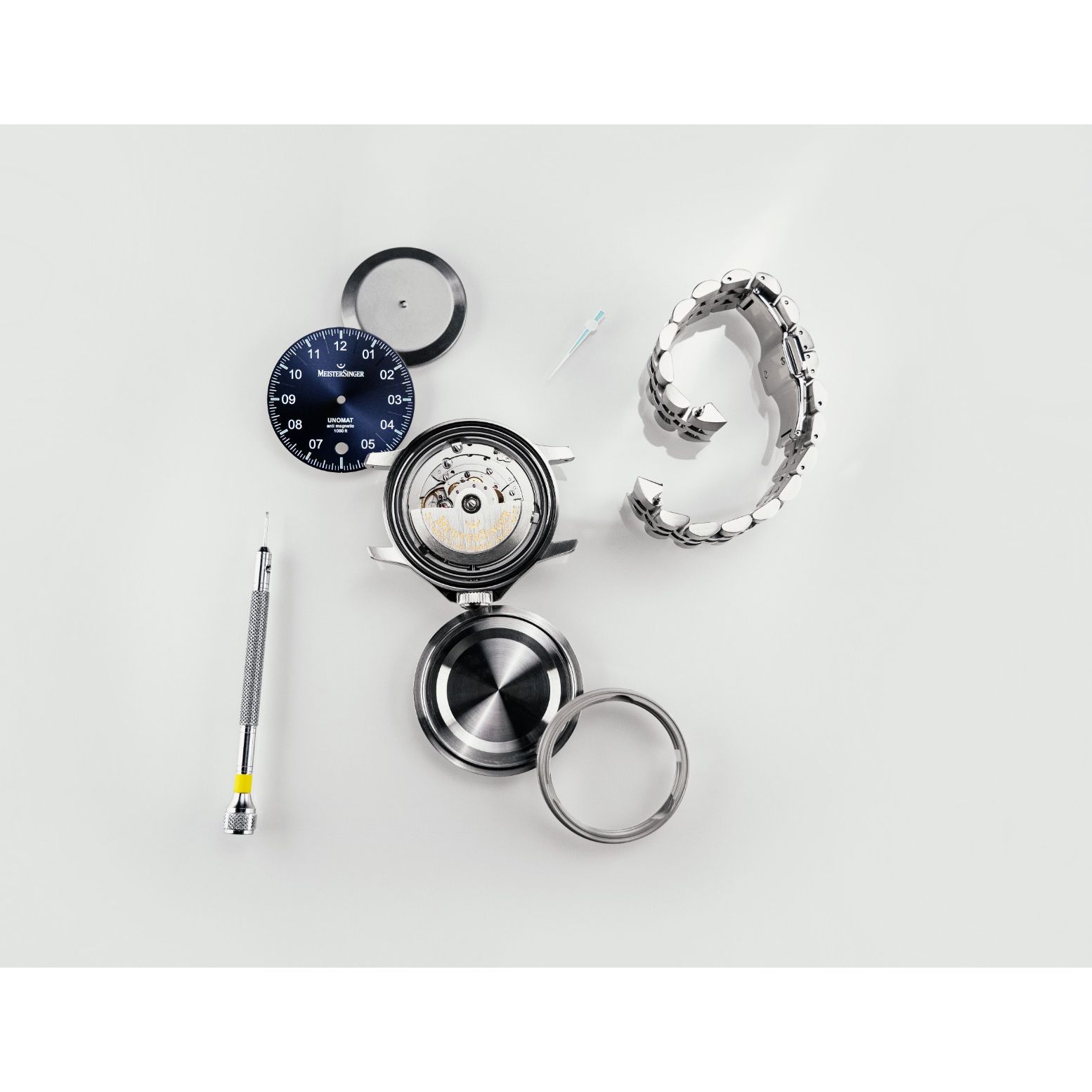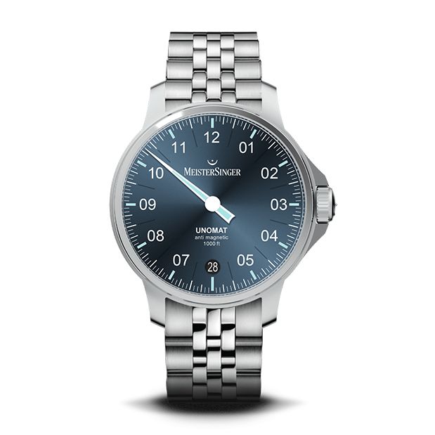 Meistersinger Unomat is ongeveer 300 gauss (tot 24.000 A/m) antimagnetisch, datumaanduiding en 38 uur gangreserve.