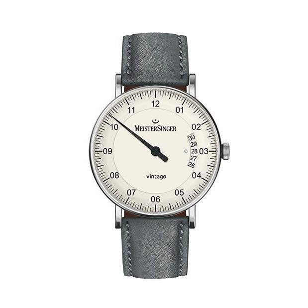 Meistersinger Vintago met één wijzer aanduiding, datumaanduiding en 38 uur gangreserve. Eventueel ook verkrijgbaar met vouwsluiting á €100,- klik hier om deze te bestellen.