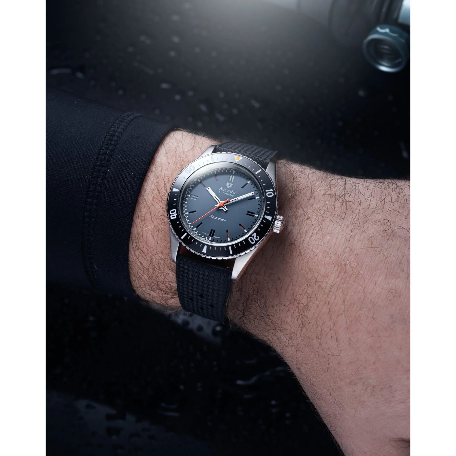 De Aquamar van Nivada Grenchen is een moderne herinterpretatie van een charismatisch duikhorloge uit de jaren ’60. Met een 38 mm stalen kast, dubbel gebold saffierglas en 200 meter waterdichtheid is hij klaar voor elk avontuur. De keramische bezel en sandwich-wijzerplaat zorgen voor vintage charme en optimale afleesbaarheid. Uniek is de tweekleurige datumring met veranderende Super-LumiNova, die dagelijks van gloed wisselt. Dit model heeft een grijze wijzerplaat met een zwarte rubberen Tropic-band en wordt aangedreven door een Zwitsers automatisch uurwerk met 38 uur gangreserve.