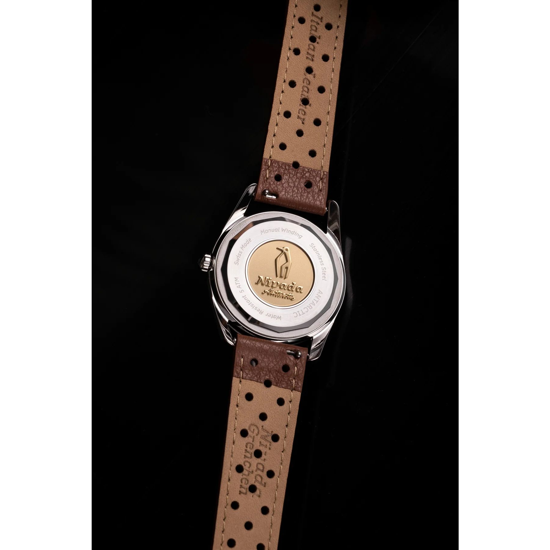 Nivada Grenchen keert terug naar zijn roots en brengt tijdloze elegantie tot leven met de Antarctic. In een slanke kast combineert het horloge vintage charme met verfijnd vakmanschap. De blikvanger is de wijzerplaat, verkrijgbaar in zwart, wit of , met Art Deco-cijfers op sleutelposities en pijlvormige indexen. Gebogen oranje lichtgevende bogen vervangen traditionele stippen, wat een uniek detail toevoegt. Het logo ‘Nivada Grenchen’ en de handtekening “Antarctic” sieren de wijzerplaat, met subtiel ‘Swiss’ op de buitenrand. Op de achterkant prijkt een gegraveerde pinguïn op een gouden medaillon als eerbetoon aan het erfgoed. Dit horloge vangt de nostalgie van de jaren ’50 in een moderne meesterwerk.