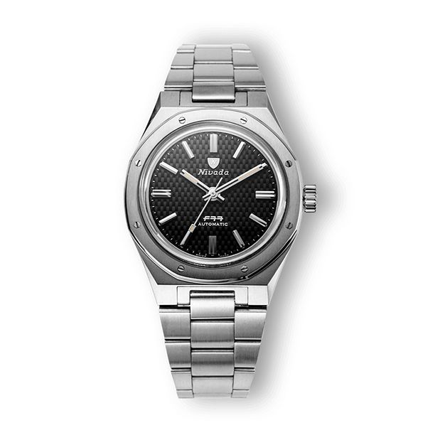 Uitsluitend verkrijgbaar met een 316L roestvrijstalen armband, wordt de F77 opnieuw uitgebracht in een formaat van 37 mm, waarmee trouw wordt gebleven aan het originele ontwerp. Het horloge heeft een wijzerplaat met een ‘carbon effect’ mandweefpatroon en opvallende baton-indexen. De baton-stijl uur- en minutenwijzers benadrukken de strakke elegantie van de stalen kast. Met een dikte van slechts 12,65 mm is het een bijzonder verfijnd horloge om te dragen. De collectie start met vier referenties, met keuze uit twee wijzerplaatkleuren: zwart of blauw, met of zonder datumaanduiding. De F77 wordt aangedreven door een Zwitsers SOPROD P024 automatisch uurwerk, verkrijgbaar met of zonder datumfunctie (zonder ‘ghost’-positie), en heeft een gangreserve