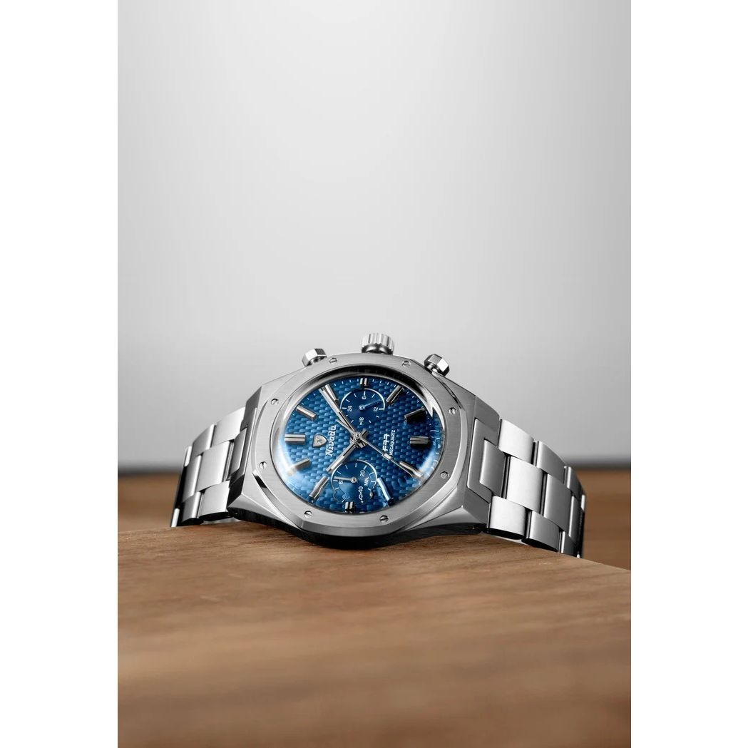 Deze nieuwe evolutie van Nivada Grenchens icoon uit de jaren 70 heeft een blauwe wijzerplaat met geweven carbonlook, afwisselend geborstelde en gepolijste stalen afwerkingen en het Zwitserse SOPROD P024 automatische uurwerk. Met zijn herontworpen geïntegreerde band voor maximaal comfort, brengt de F77 38 mm meer uitstraling, meer kracht en hetzelfde onmiskenbare erfgoed.