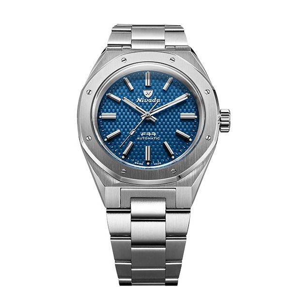 Deze nieuwe evolutie van Nivada Grenchens icoon uit de jaren 70 heeft een blauwe wijzerplaat met geweven carbonlook, afwisselend geborstelde en gepolijste stalen afwerkingen en het Zwitserse SOPROD P024 automatische uurwerk. Met zijn herontworpen geïntegreerde band voor maximaal comfort, brengt de F77 41 mm meer uitstraling, meer kracht en hetzelfde onmiskenbare erfgoed.