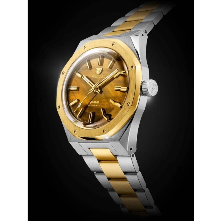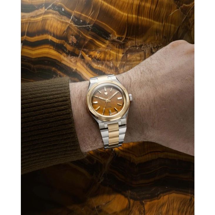 Als laatste editie van de F77 Mark I sluit dit horloge een bepalend hoofdstuk af in de geschiedenis van Nivada Grenchen, een waar verzamelobject dat de geest van de originele F77 eert. Tijgeroog wordt geassocieerd met focus, moed en bescherming. De goudbruine banden komen tot leven met een kattenoogglans (chatoyancy) die prachtig verschuift met het licht. In Two Tone combineert de F77 deze warme, levendige steen met een verfijnde stalen en gouden kast, wat een erfgoedkarakter en een moderne, sportieve gloed aan de pols geeft.