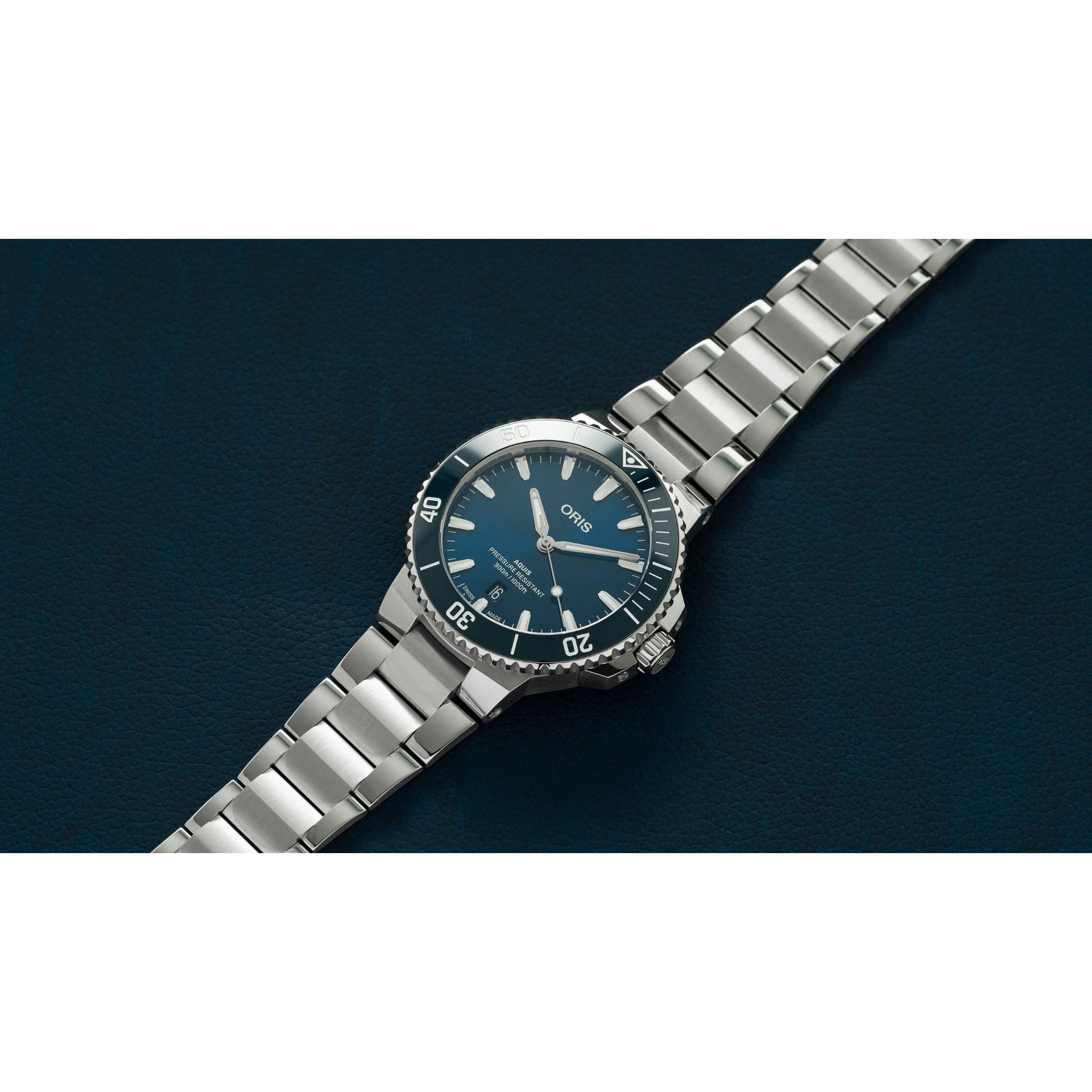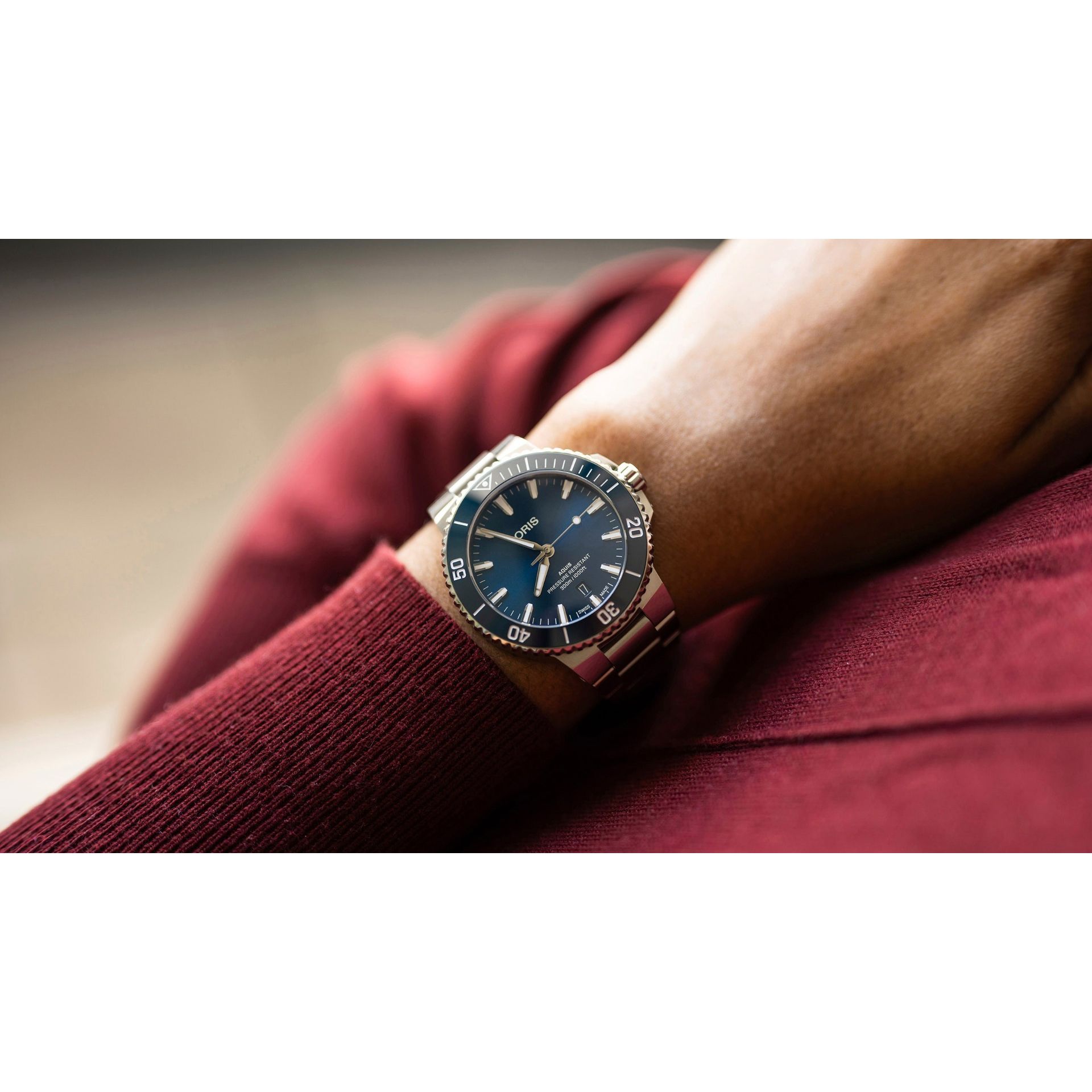 De Oris Aquis Date 41.5 mm is een sportief en stijlvol duikhorloge met een diepblauwe sunray-wijzerplaat en bijpassende blauwe keramische duikring. De kast en band zijn uitgevoerd in roestvrij staal, met een krasvast saffierglas en schroefkroon voor een waterdichtheid tot 300 meter. Binnenin tikt het automatische Caliber 733-uurwerk met een gangreserve van circa 38 uur – een betrouwbare keuze voor dagelijks gebruik en avonturen onder water.