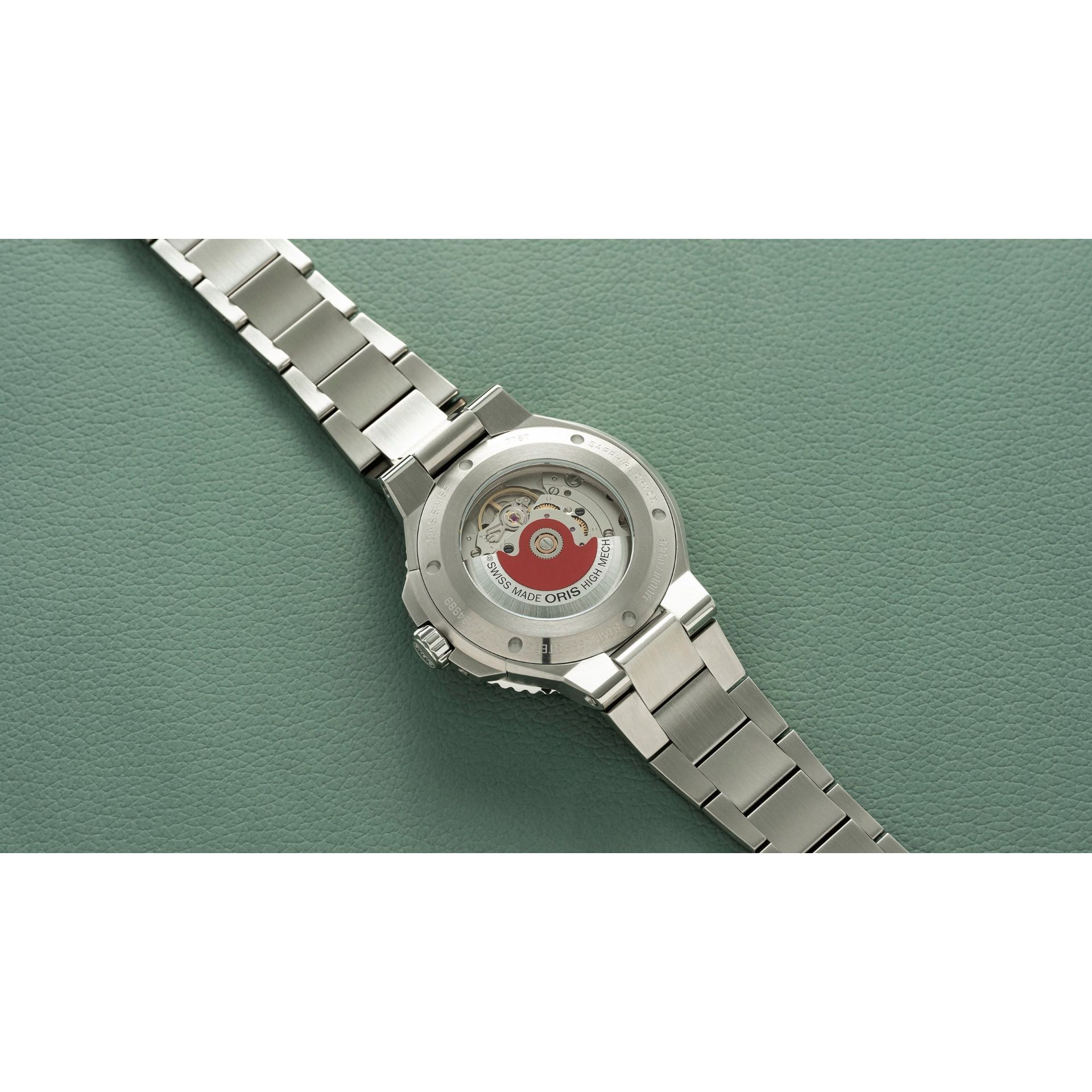 De Oris Aquis Date Green valt op met een diepe, zonnevlam-groene wijzerplaat met bijpassende groene keramische duikring, omringd door een stevige stalen kast en band. Aan het hart tikt het betrouwbare automatische Caliber 733‑1 met een gangreserve van circa 41 uur, afgedekt door een saffierglas en zichtbodem. Met 300 meter waterdichtheid, schroefkroon en steenharde afwerking vormt dit model een perfecte combinatie van sportiviteit, verfijning en praktische duikfunctionaliteit .