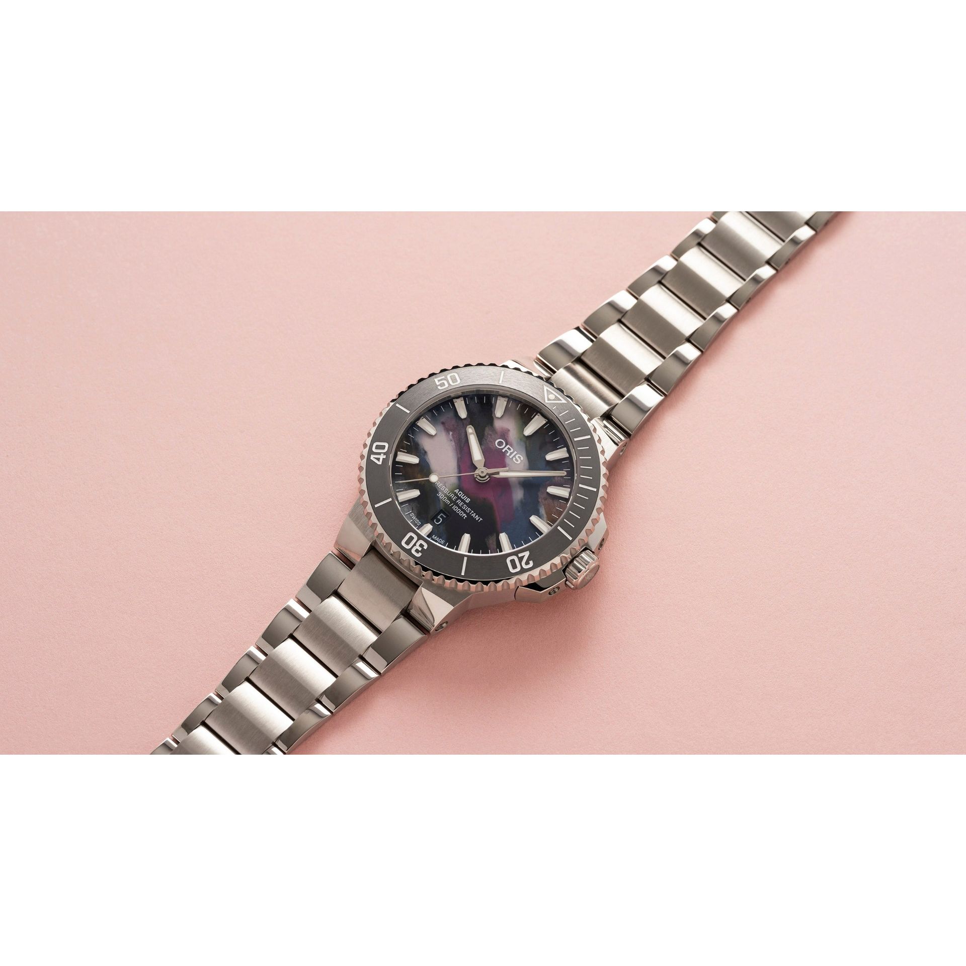Deze Oris Aquis Date heeft een Multicolor wijzerplaat, Mat stalen lunette en 38 uur gangreserve.
