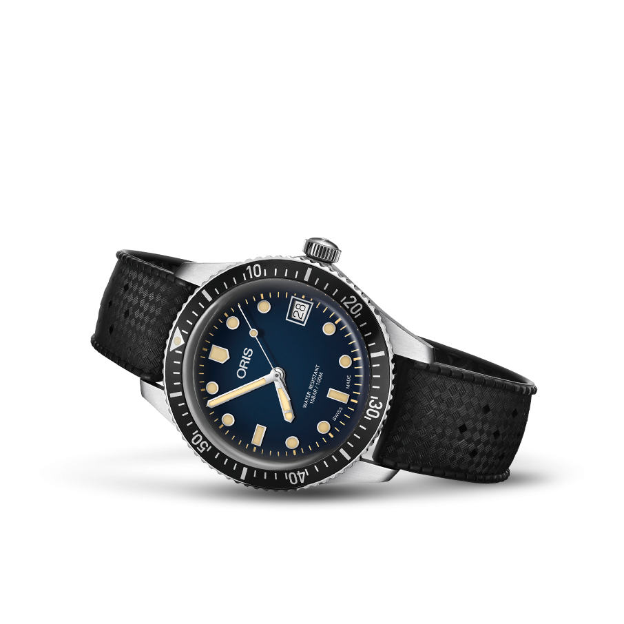Deze Oris Divers Sixty-Five heeft een datumaanduiding met 38uur gangreserve