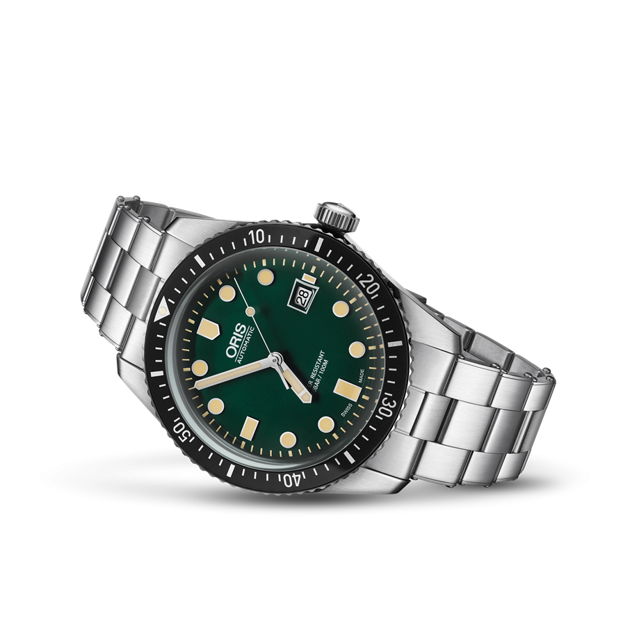 Deze Oris Divers Sixty-Five heeft een datumaanduiding en retro light old radium luminova. Lees hier onze blog over dit bijzondere Oris horloge.