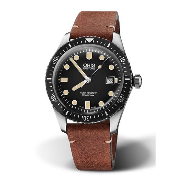 Deze Oris Divers Sixty-Five heeft een datumaanduiding en retro light old radium luminova.