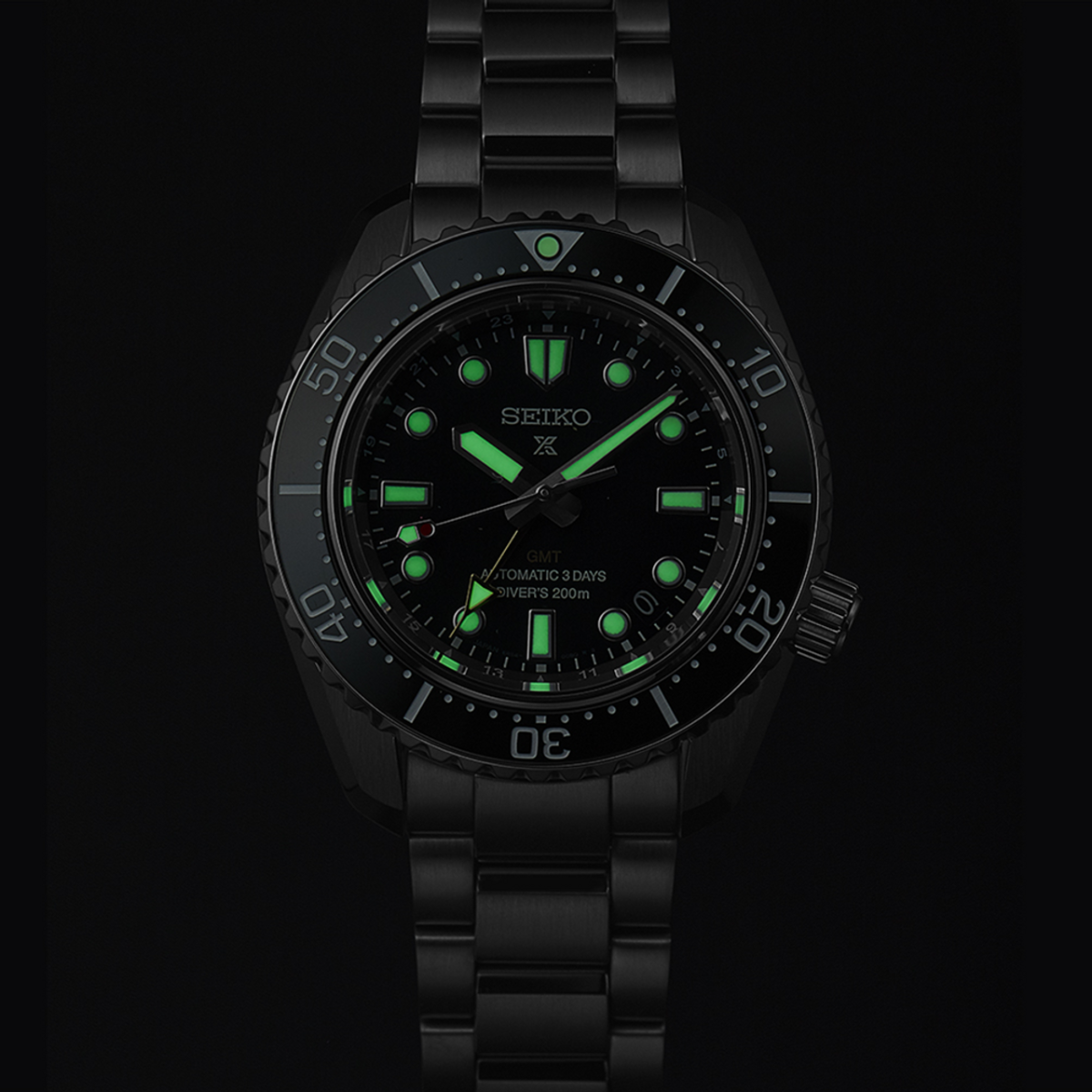 De Seiko Prospex GMT heeft een datum en 72 uur gangreserve.