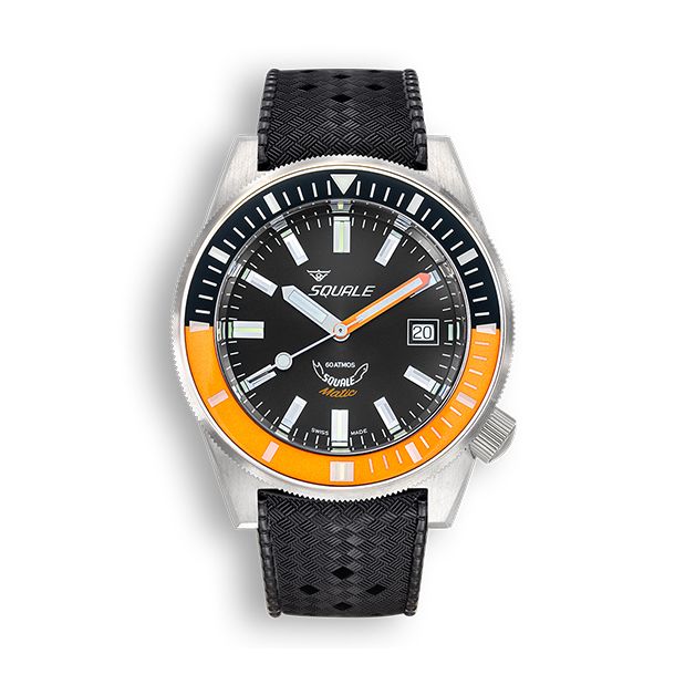 Squale Matic met datumaanduiding, zwarte en oranje lunette en 38 uur gangreserve.