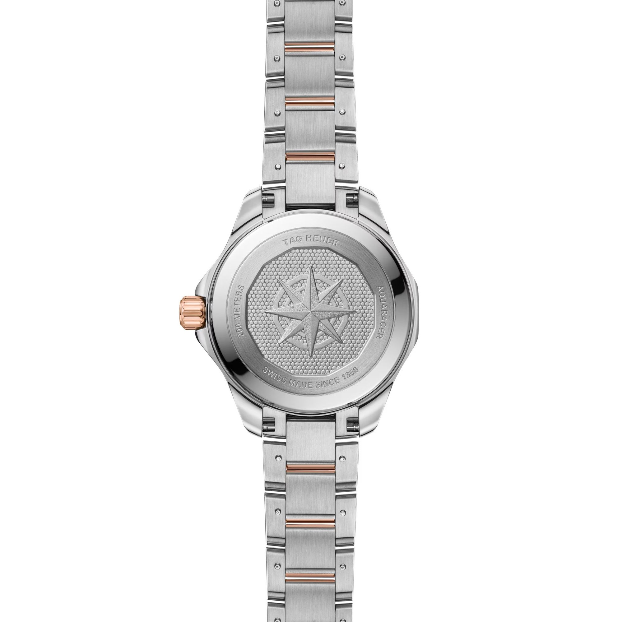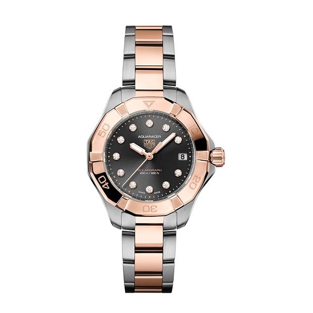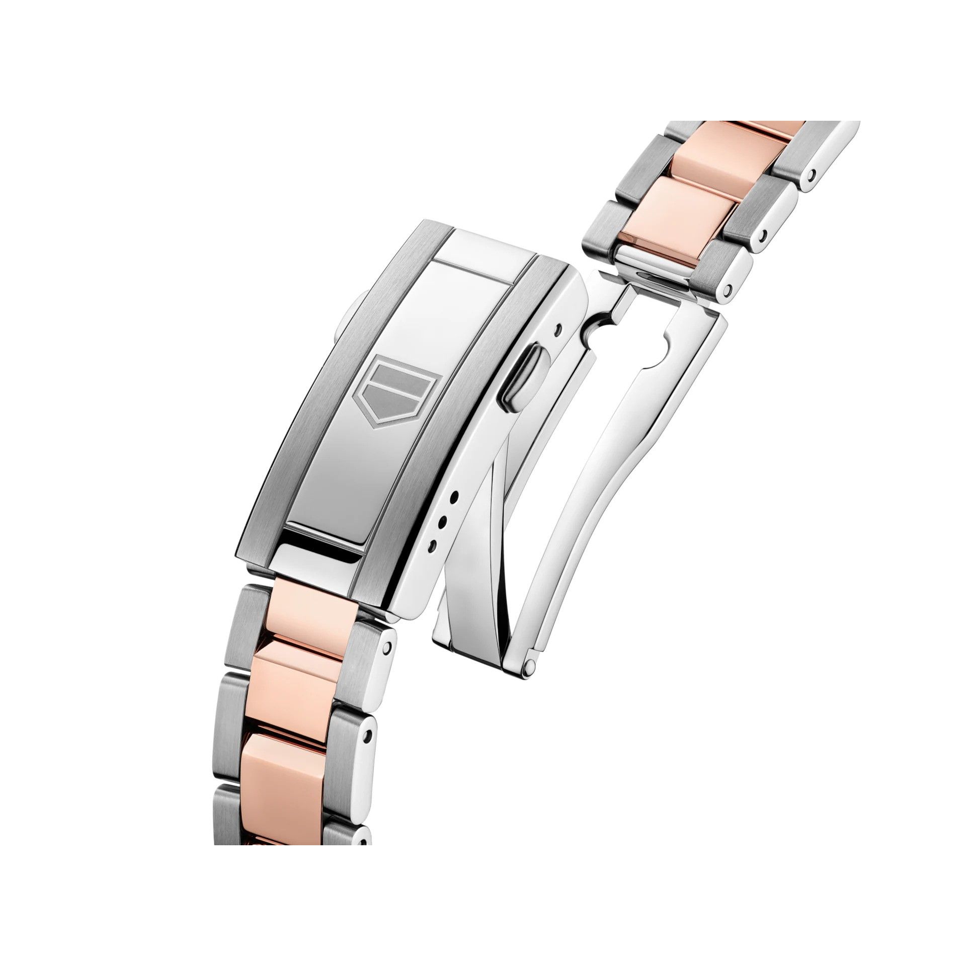 De Zwart zonnestraal-geborstelde wijzerplaat vormt een krachtig contrast met de vergulde details in 18K 2N Rosegoud. Omrand door een Rose goudkleurige bezel en bezet met 11 fonkelende diamanten indexen straalt het horloge pure luxe uit. Het rijke kleurenspel en de gepolijste afwerking zorgen voor een opvallende, stralende uitstraling bij deze TAG Heuer Aquaracer.