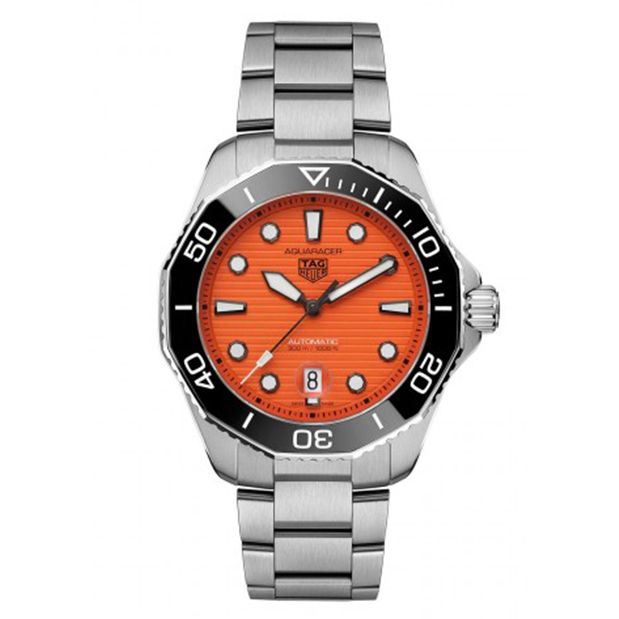 De TAG Heuer Aquaracer Professional 300m oranje heeft datumaanduiding met 38 uur gangreserve.