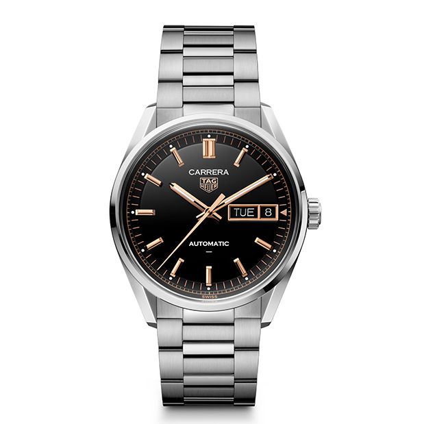 De nieuwste TAG Heuer Carrera Day-Date heeft een 41mm roestvrijstalen kast met een elegante zwarte sunray-wijzerplaat en rosé index. Het horloge beschikt over een dag- en datumweergave op de 3-uur positie, met gepolijste en lichtgevende wijzers en uurmarkeringen. Aangedreven door een automatisch uurwerk, biedt het een gangreserve tot 80 uur en is het waterbestendig tot 100 meter.
