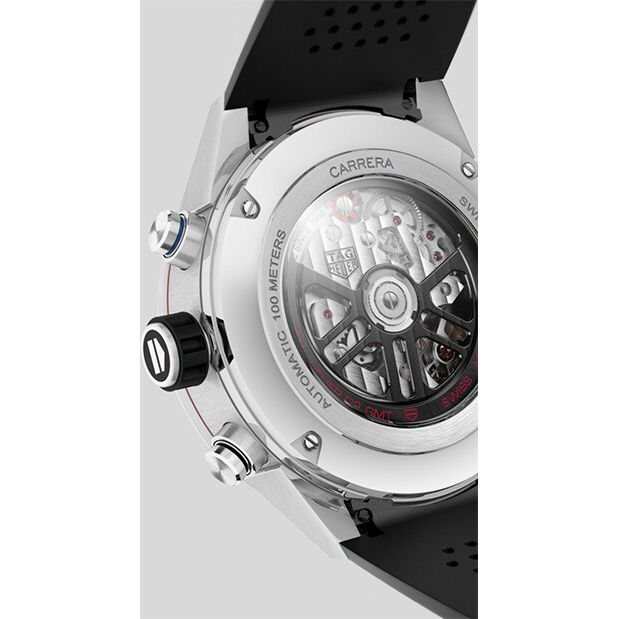 TAG Heuer Carrera Calibre Heuer 02 GMT heeft een datumaanduiding, chronograaf en GMT. Als chronograaf niet loopt dan heeft het uurwerk 75 uur gangreserve.
