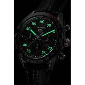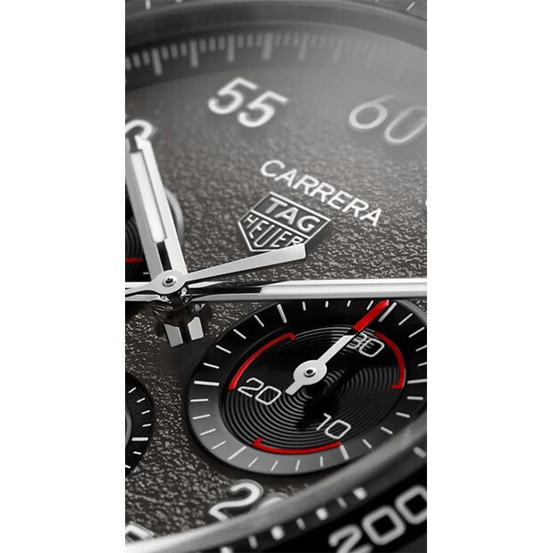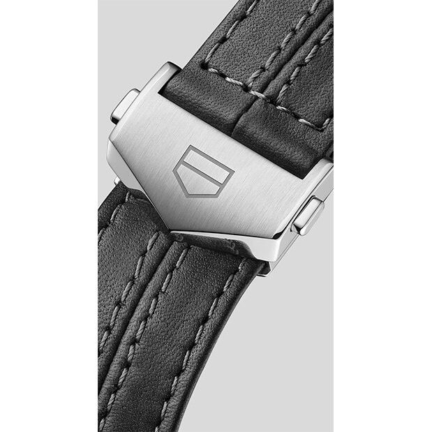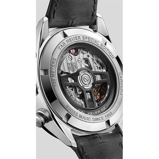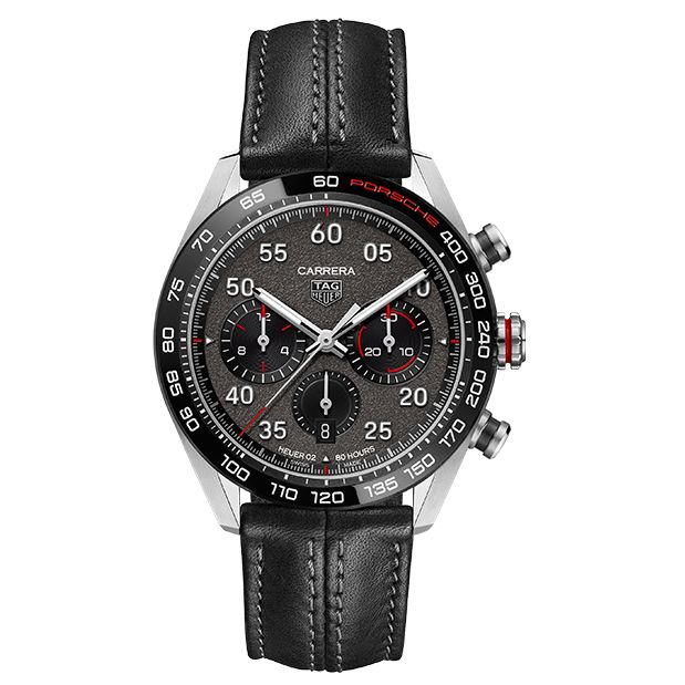 Een door Porsche geïnspireerde chronograaf, aangedreven door het in-house Heuer 02 chronograaf uurwerk met 80 uur gangreserve. Een achterkant van de kast van saffierkristallen onthult de opnieuw ontworpen oscillerende massa, als eerbetoon aan het beroemde stuur van Porsche. Op de asfaltgrijze wijzerplaat zijn Arabische cijfers gebruikt. 44 mm fijn geborstelde kast en heeft een zilverwit gerhodineerde centrale wijzer, en de zwart vergulde indexen en uren- en minutenwijzers zijn behandeld met witte Super-LumiNova®. Begeleid door een zwarte kalfsleren band in reliëf met witte stiksels die het Porsche-interieur weerspiegelen.