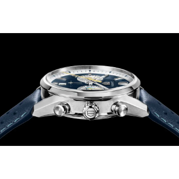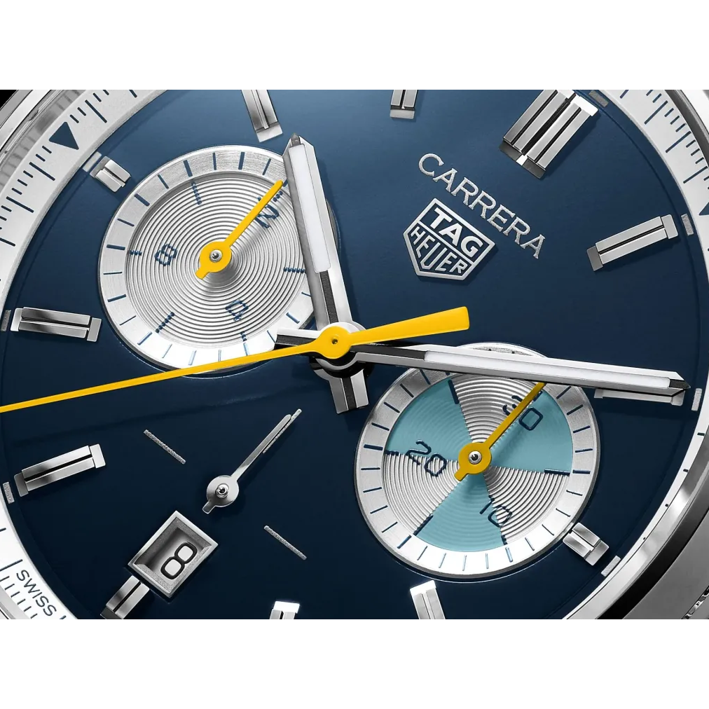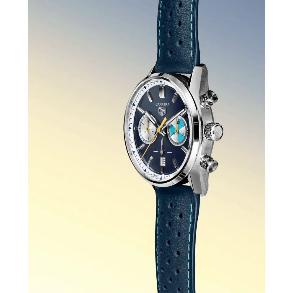 Met een diepblauwe wijzerplaat, turquoise accenten en gedurfde gele details straalt het horloge energie en moderne klasse uit, terwijl het subtiele knipoog geeft naar het iconische ontwerp uit de jaren 50 en 60. Deze Carrera slaat een brug tussen verleden en heden. Het is een meesterwerk voor wie elke dag met passie en stijl beleeft
